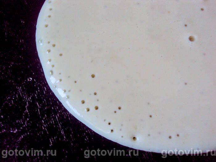 Когда на поверхности теста начнут появляться пузырьки — можно переворачивать блинчик на другую сторону. Через несколько секунд проверьте обратную сторону — блинчик, скорее всего, уже подрумянился. Снимите его лопаткой и положите на плоское блюдо или обычную тарелочку.