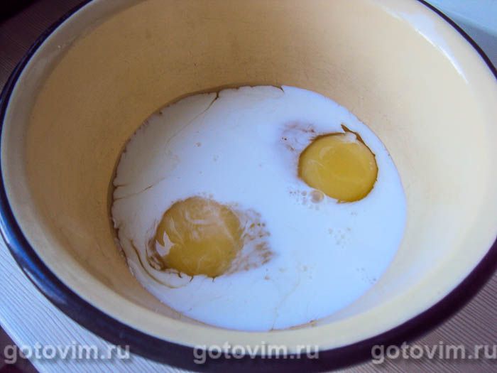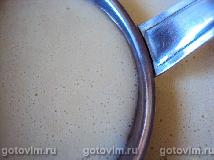 Туда же постепенно вливайте молоко, тщательно перемешивая венчиком. В получившуюся массу добавьте сахар и муку, продолжая помешивать, пока консистенция не станет однородной. Со временем на поверхности появятся пузырьки. Тесто должно быть похожим на жидкую сметану, как и обычное блинное тесто.