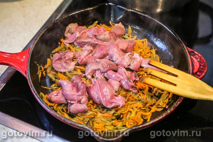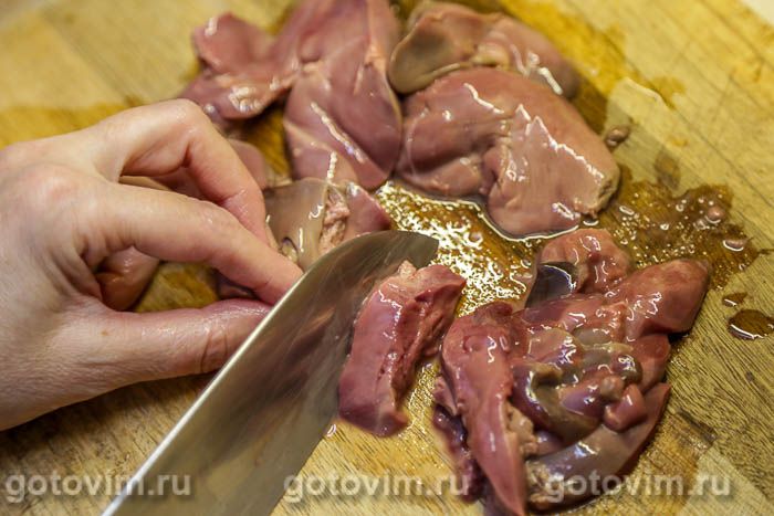 Куриную (или говяжью) печень промыть, обсушить на бумажных полотенцах, зачистить от пленок. Крупные кусочки куриной печени разрезать пополам.