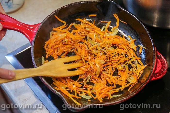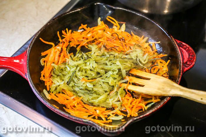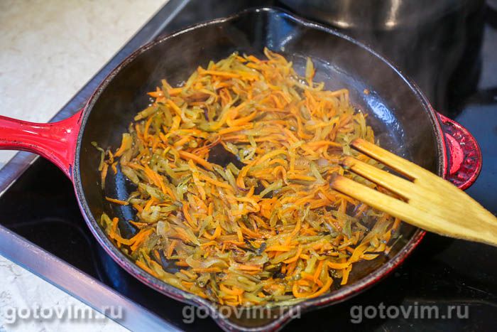 Пассеровать лук с морковью на растительном масле, пока овощи не станут мягкими.