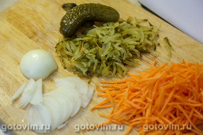 Соленые бочковые огурцы нарезать небольшими соломкой. Кожицу с огурцов можно не срезать. Репчатый лук порезать тонкими полукольцами. Морковь очистить, нарезать соломкой или натереть на крупной терке.