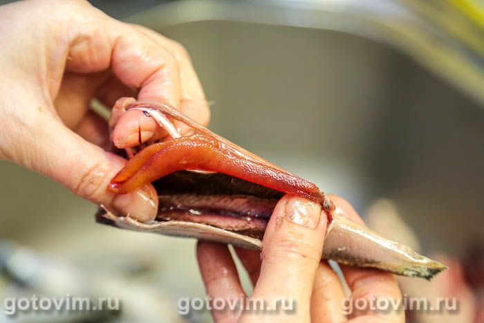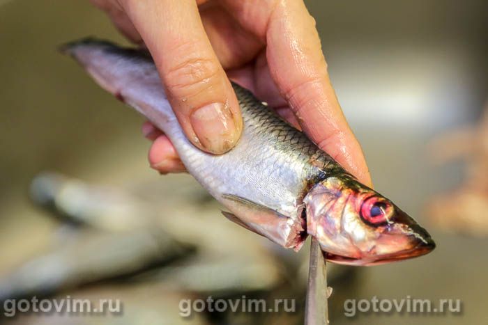 Сначала подготовит рыбу. Тушки выпотрошить, срезать все плавники и отрезать голову.