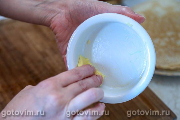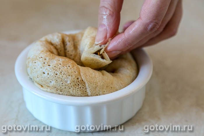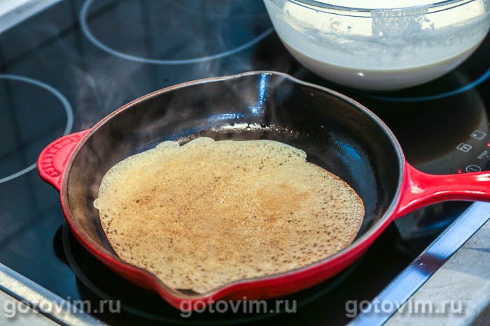 Приготовить тесто для блинов по любому рецепту. Я пекла простые дрожжевые блины.