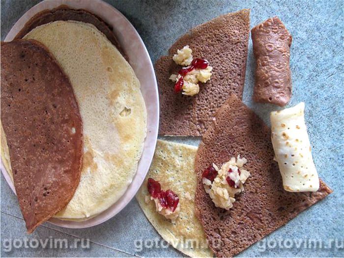 Выпечь блины. Их получится примерно 16 шт. стандартного размера. Сначала испечь первые 8 блинов, потом в тесто добавить корицу и какао-порошок, разведённый в небольшом количестве молока (воды), и выпекать следующие 8 или 9 тонких блинов.