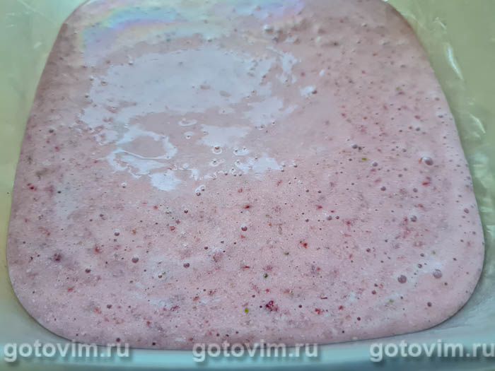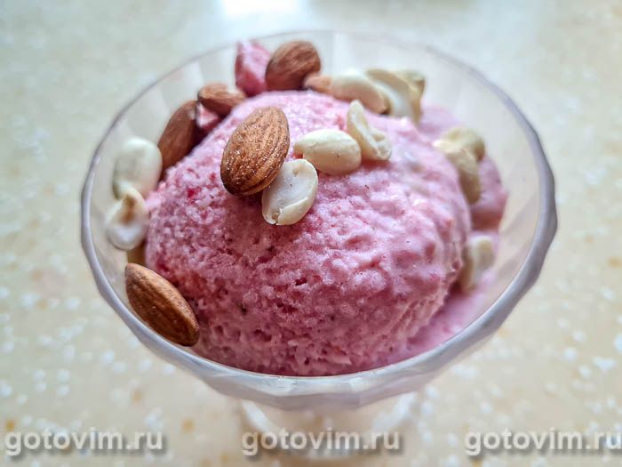 Получившуюся клубнично-банановую смесь перелить в контейнер с крышкой и убрать в морозилку. Перемешивать мороженое ложкой через каждый час, чтобы в готовом десерте были маленькие кристаллики льда. Готовый десерт разложить по креманкам, украсить орешками или ягодами. Приятного аппетита!