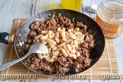 Через 10 минут добавить в сковороду консервированную фасоль, предварительно слив с неё жидкость. Тщательно перемешать и снять с огня.