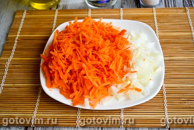 Морковь очистить и натереть на крупной терке. Лук очистить и нарезать небольшими кубиками.