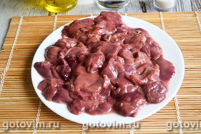 Куриную печень тщательно вымыть и мелко нарезать.