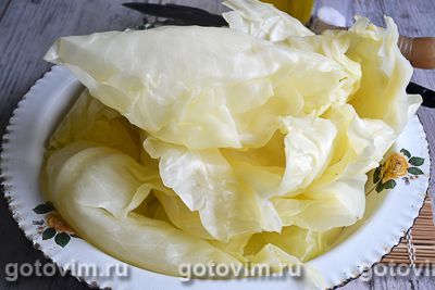 Кочан капусты полностью залить водой и проварить. Снять мягкие листья капусты и отбить толстую часть.