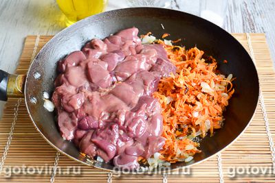 На сковороде с добавлением растительного масла обжарить лук и морковь 3-4 минуты. Через 3-4 минуты добавить куриную печень. Добавить соль и перец. Готовить 10 минут.