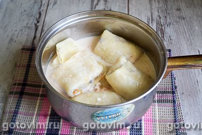 Переложить голубцы в сотейник и залить заливкой. По желанию можно приготовить соус к голубцам. Отдельно взбить миксером желтки и добавить 2-3 ст. л. теплого соуса. Взбитые желтки с соусом соединить с оставшимся соусом и еще раз тщательно перемешать. Добавить соль и перец по вкусу. Голубцы с рыбой готовы. Приятного аппетита!