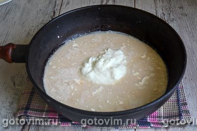 Слить жидкость, в которой варились голубцы, и процедить с помощью сита. Перелить жидкость в сотейник и добавить сметану. Варить на умеренном огне до легкого загустения.