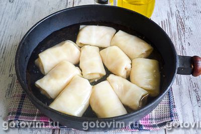 На сковороду, смазанную растительным маслом выложить голубцы швом вниз. Залить голубцы рыбным бульоном и вином. Варить 10 минут.
