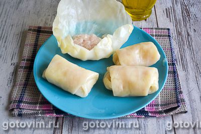 Начинку выложить на листы капусты и свернуть голубцы.