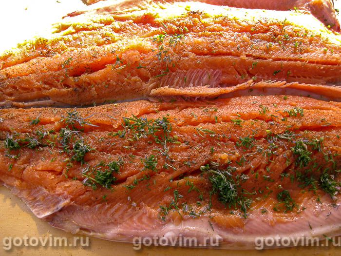 Следующим этапом готовки будет засолка рыбы. Для этого мясо нужно натереть крупной солью, посыпать чёрным перцем, молотым кардамоном и мелко нарезанным укропом.