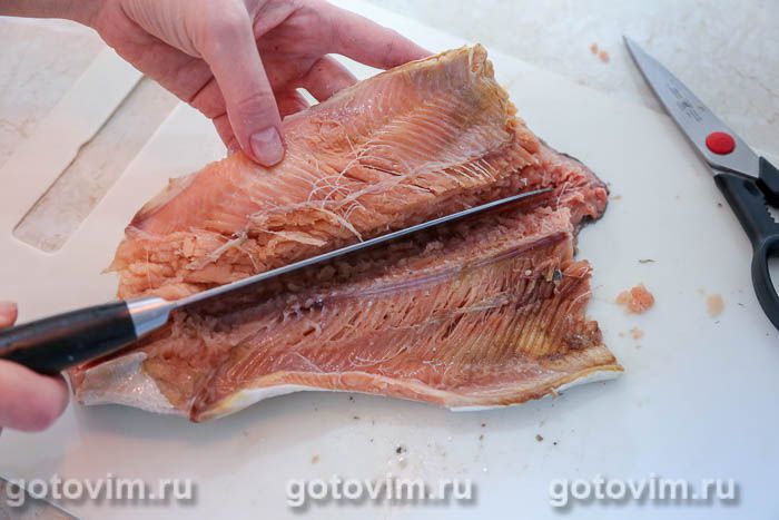 Горбушу почистить, выпотрошить, стараясь не задеть желчный пузырь. Если он лопнет, рыба будет горчить! Голову отрезать, тушку промыть, тщательно удалив черную пленку от внутренностей в брюшке.