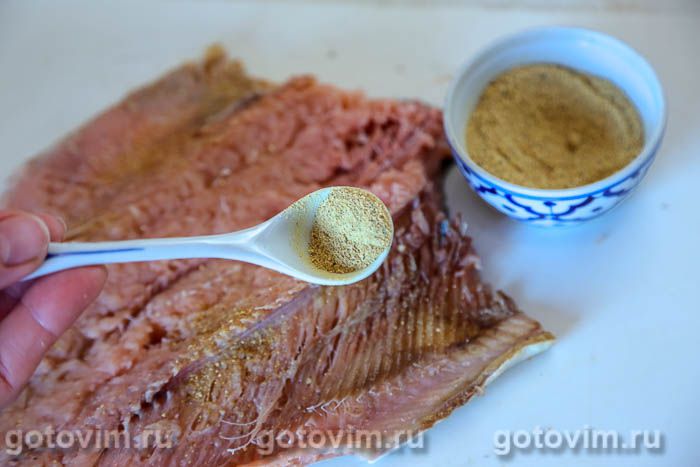 С внешней и внутренней стороны натереть горбушу лимонным перцем. Я его готовила сама, добавляла в смесь соль, поэтому дополнительно солить рыбу не надо. Сложить рыбу в пакет и убрать в холодильник хотя бы на 1 час.