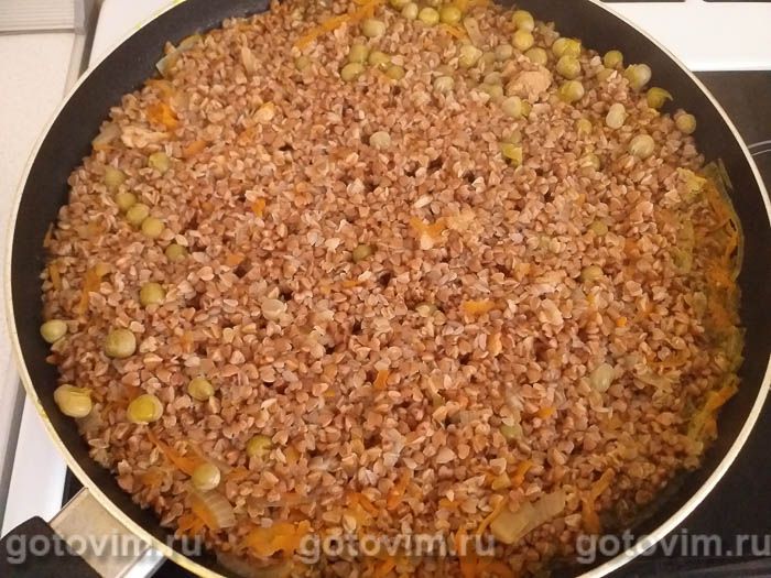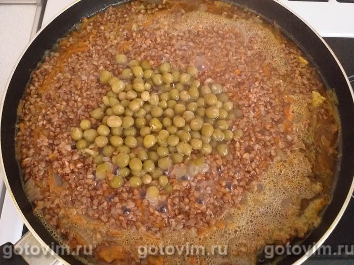 Когда гречка будет уже почти готова, добавьте консервированный зеленый горошек. Готовую гречку накройте крышкой, пусть она немного настоится и пропарится. Затем перемешайте содержимое сковороды, чтобы мясо и овощи равномерно распределились в готовой каше.