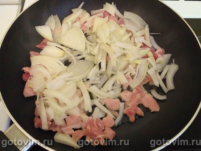 Очистите лук и покрошите четвертинками. Добавьте в сковороду.