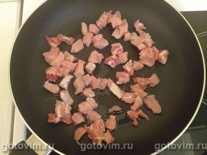 Свинину промойте под холодной проточной водой, обсушите на бумажном полотенце и нарежьте на небольшие кусочки. Налейте в разогретую сковороду немного растительного масла и выложите туда порезанное мясо. Начните обжаривать, помешивая лопаткой.