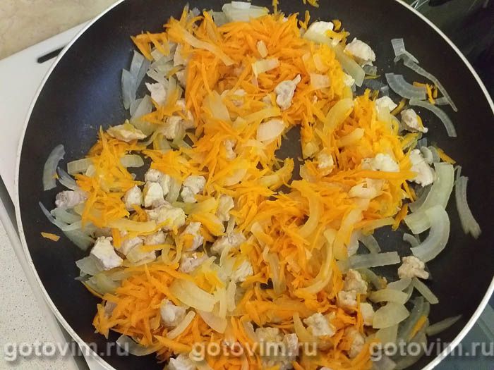 Обжаривайте мясо с луком несколько минут, а затем плотно накройте крышкой. Очищенную и вымытую морковь натрите на крупной тёрке или покрошите соломкой, добавьте её к мясу и луку.