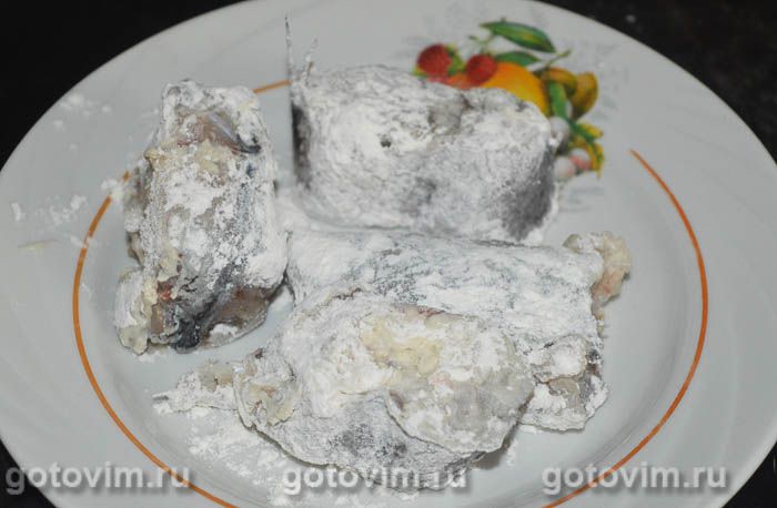 Кусочки хека сначала обваливаем в муке, затем окунаем в кляр.