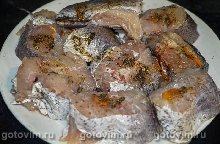 Хек размораживаем, обрезаем плавники, затем режем тушку на порционные кусочки и рыбы посыпаем солью с молотым черным перцем. Оставляем на 10-15 минут при комнатной температуре.