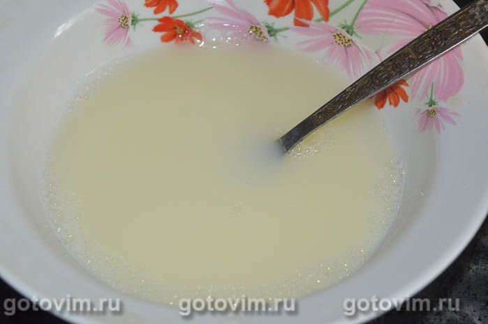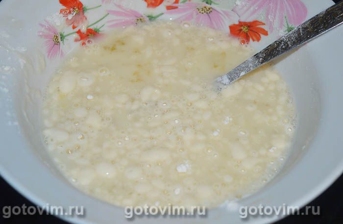 В полученную смесь засыпаем просеянную муку, аккуратно перемешиваем до получения однородной массы без комочков.