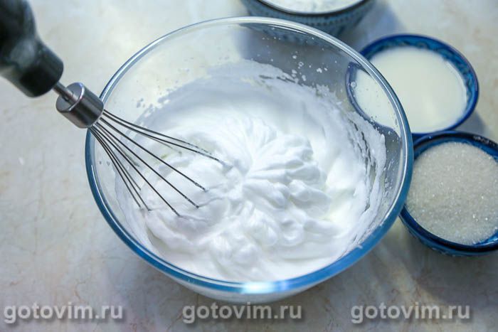Взбить белки в устойчивую пену, добавив щепотку соли и примерно 1/6 часть сахара.
