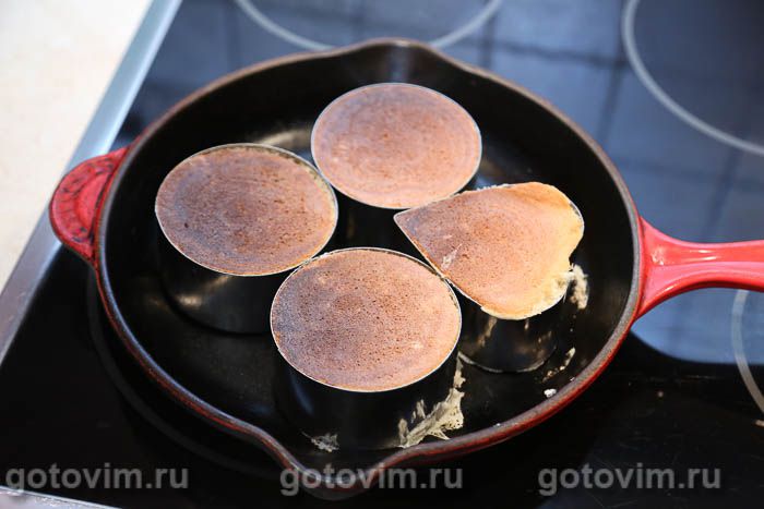 Разогреть сковороду на очень маленьком огне. Пока сковорода разогревается, смазать с внутренней стороны формы для панкейков (у меня металлические кольца для формовки салатов диаметр 7 см и высотой 5 см). Если нет готовых форм, то сделайте их из пекарской бумаги. Или пеките панкейки совсем без форм.