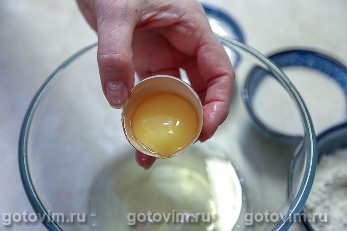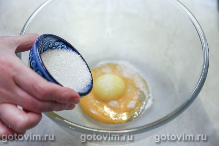 В другой миске растереть добела яичные желтки с остальным сахаром.