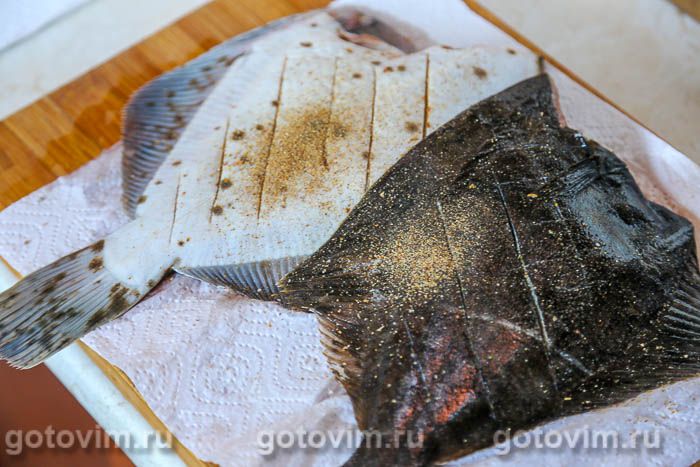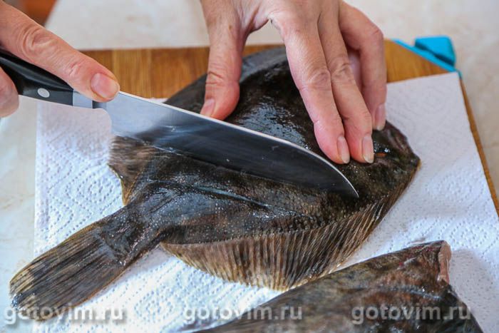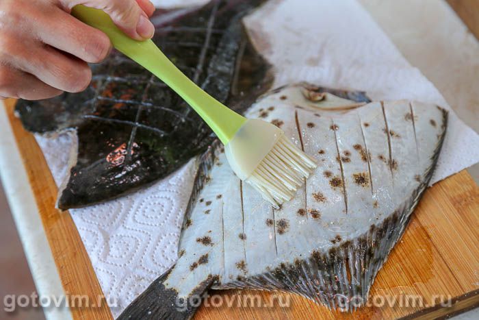 На моей решетке умещается по 2 небольшие камбалы, поэтому рассчитываю все продукты в рецепте на 2 рыбины среднего размера. Камбалу вымыть, отрезать голову и выпотрошить. Промокнуть рыбину снаружи и внутри бумажным полотенцем и удалить черную пленку и кровь вдоль позвоночника камбалы (естественно, внутри, в полости рыбы). Плавники (все, включая хвостовой) можно отрезать. На огне они все равно сгорят.