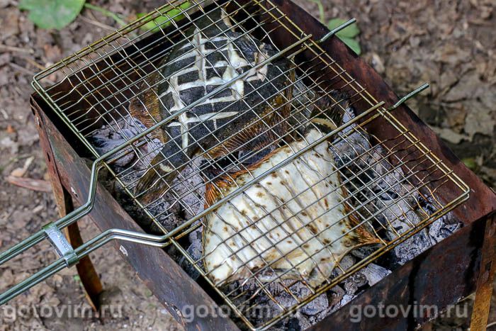Дать углям прогореть в мангале. Положить рыбу на решетку, закрепить и установить на мангал. Готовить с одной стороны, затем перевернуть и жарить с другой.