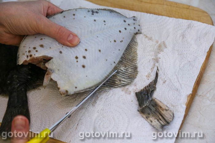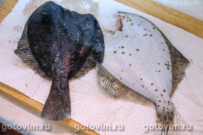 Плавники (включая хвостовой) отрезать. Натереть подготовленные тушки камбалы солью и перцем снаружи и внутри.