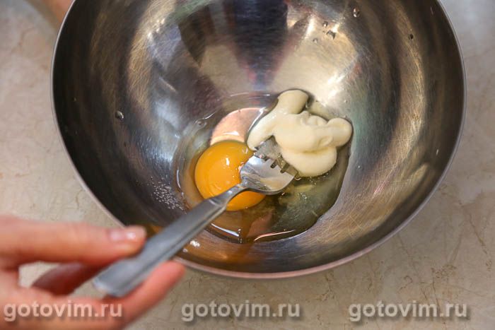 Приготовить кляр на майонезе. Для этого в небольшой миске венчиком или вилкой размешать яйцо с соль. Добавить майонез, пропущенный через пресс чеснок и по частям примешать муку. В результате у вас получится однородное тесто, по консистенции напоминающее тесто для оладий.