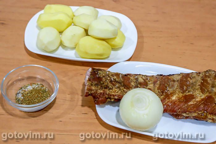 Картофель очистить, нарезать крупными дольками. Ребрышки разрезать на части по 2 косточки на порцию. Лук нарезать полукольцами.