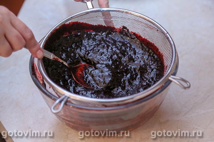 По частям протереть ягодное пюре через металлическое сито, чтобы удалить семена и черничную кожицу.