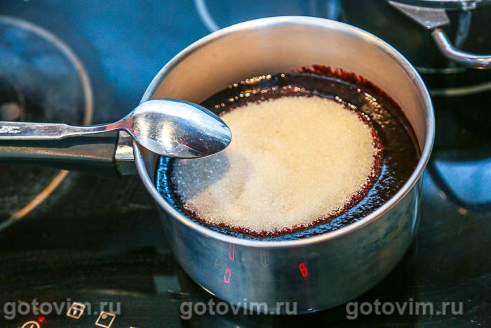 Переложить ягодное пюре в небольшой ковш, всыпать сахар (1-2 ст.л. сахара отложить в сторону), перемешать и поставить на огонь. Довести черничное пюре с сахаром до кипения, вылить свежевыжатый лимонный сок, и варить 5 минут, непрерывно помешивая.