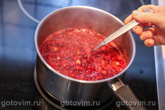 Красную смородину промыть, откинуть на дуршлаг, и когда вся вода с ягод стечет, удалить веточки. Ягоды без веточек пересыпать в небольшую кастрюлю, влить примерно 1/4 стакана воды и поставить на слабый огонь. Довести под крышкой до кипения. Когда ягоды начнут лопаться, снять кастрюлю с огня.