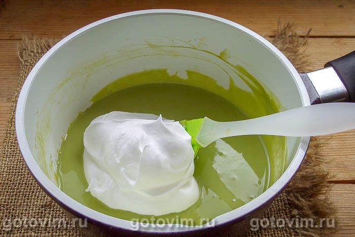 Цвет, конечно, не насыщенный зеленый, так что при желании можно добавить пищевой краситель. Оставить до полного остывания, периодически перемешивая, чтобы предотвратить образование на поверхности корочки.