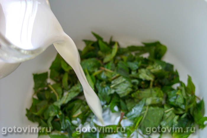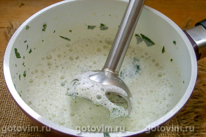 Затем пробить мяту с молоком погружным блендером. Так удастся добыть из мяты максимум вкуса и аромата. Сито выстелить марлей и процедить молоко. Листочки мяты останутся на марле, которую надо очень хорошо отжать. А в миске будет ароматное мятное молоко.