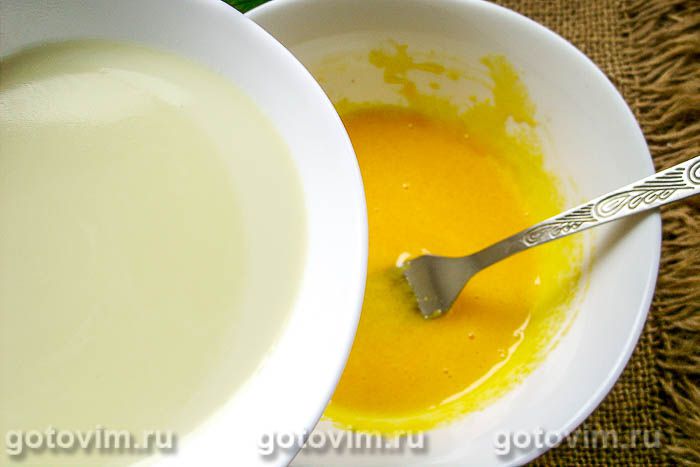 Добавить молоко. Перемешать. Перелить смесь в кастрюлю и, на самом слабом огне при постоянном помешивании, довести её до легкого загустения.