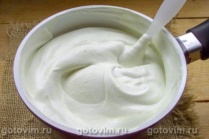 Перемешать аккуратно, двигая ложкой снизу вверх, и ввести остальные сливки. Масса станет воздушной.