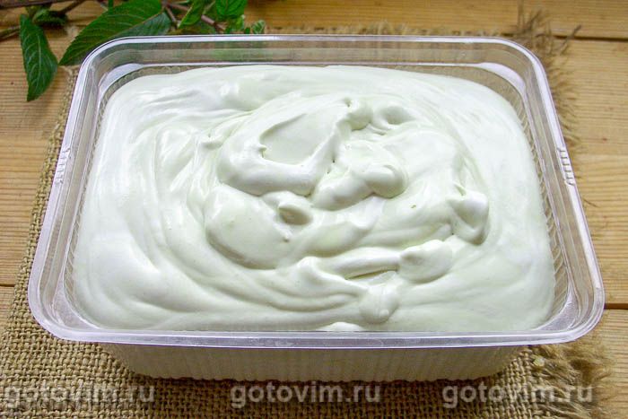 Выложить половину взбитых сливок в охлажденный мятный крем.