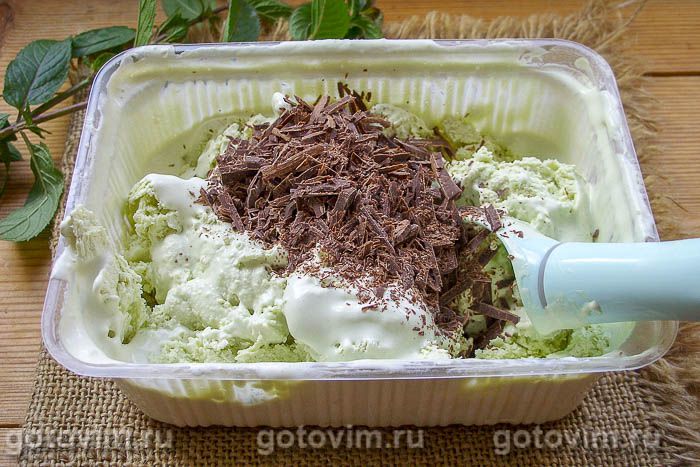 Переложить мятное мороженое в контейнер, подходящий для замораживания, и поставить в морозилку. Раз в 30 минут доставать контейнер с мороженым и перемешивать. Так делать на протяжении 3-4 часов, разбивая кристаллики льда. Когда мятное мороженое станет уже сложно мешать ложкой, добавить нарезанный тонкой стружкой горький шоколад.