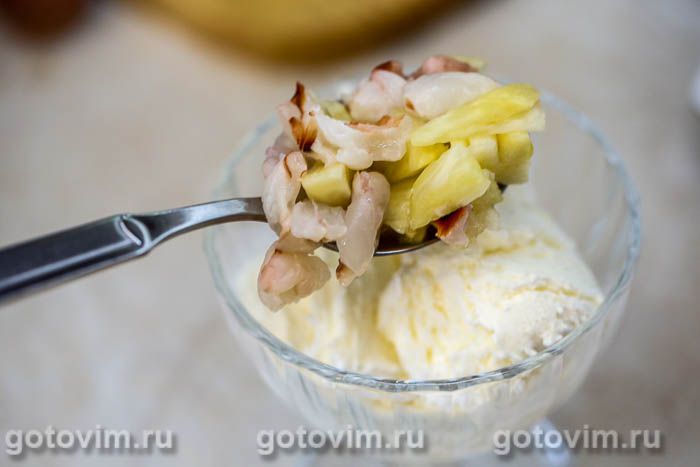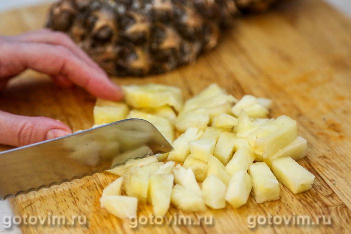 До начала сервировки готовое мороженое держать в холодильнике. Ананас очистить, как описано в этом рецепте, и порезать небольшими кубиками.