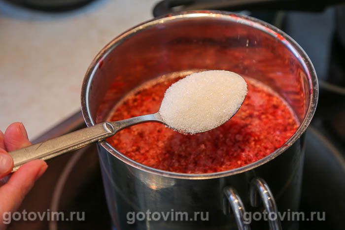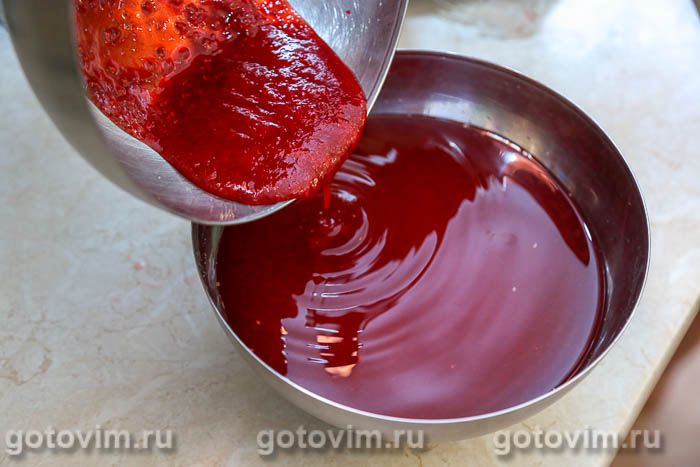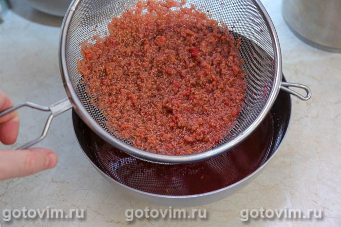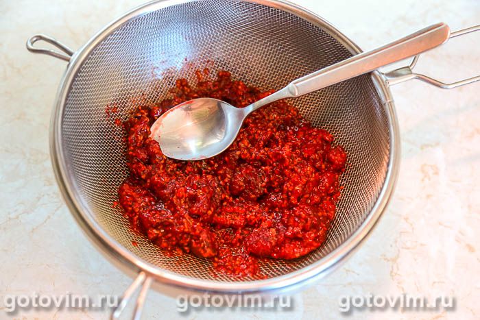 Подготовленные ягоды протереть через металлическое сито и собрать малиновое пюре без косточек.