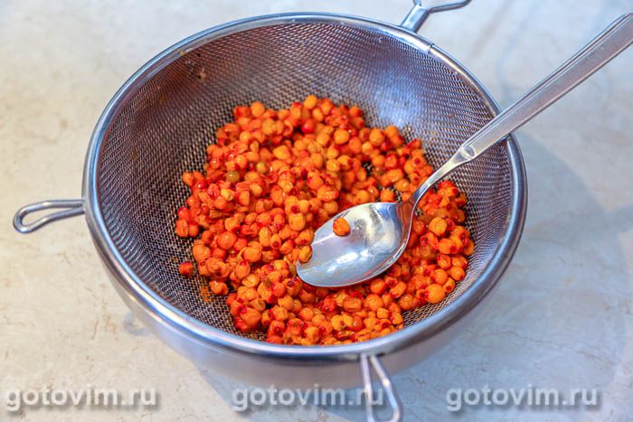 Ягоды немного помять толкушкой, переложить на дуршлаг, снова хорошенько помять ложкой и отцедить сок. Собранный сок убрать в холодильник.