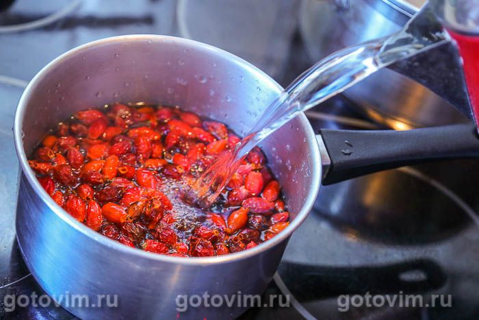 Пересыпать подготовленный шиповник в небольшую кастрюлю или ковш, залить кипятком. Если лень взвешивать ягоды и отмерять воду, берите их на глаз в соотношение 1:1. Оставить шиповник в таком виде на сутки.