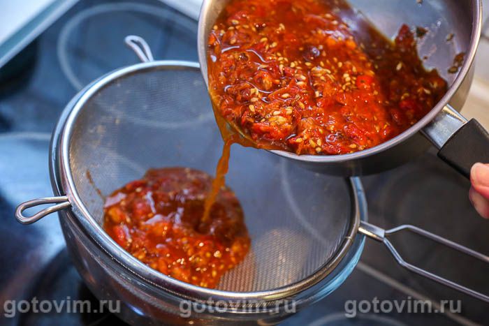 Процедить через металлическое сито. Оставшийся в сите жмых хорошо отжать.